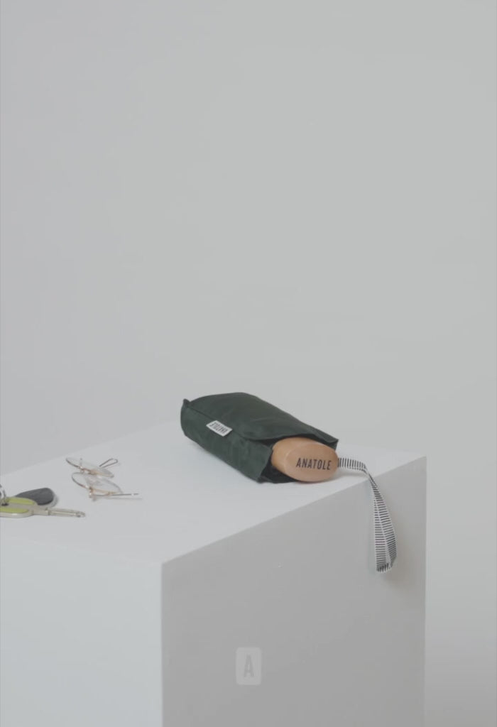 The urban Parisian umbrella brand Anatole is the only micro-umbrella built with such a concentration of high-quality materials: wooden handle, grosgrain hand strap, metal press stud fastener.